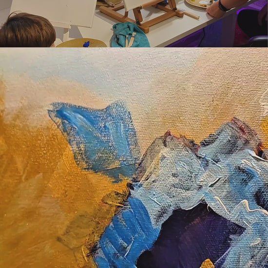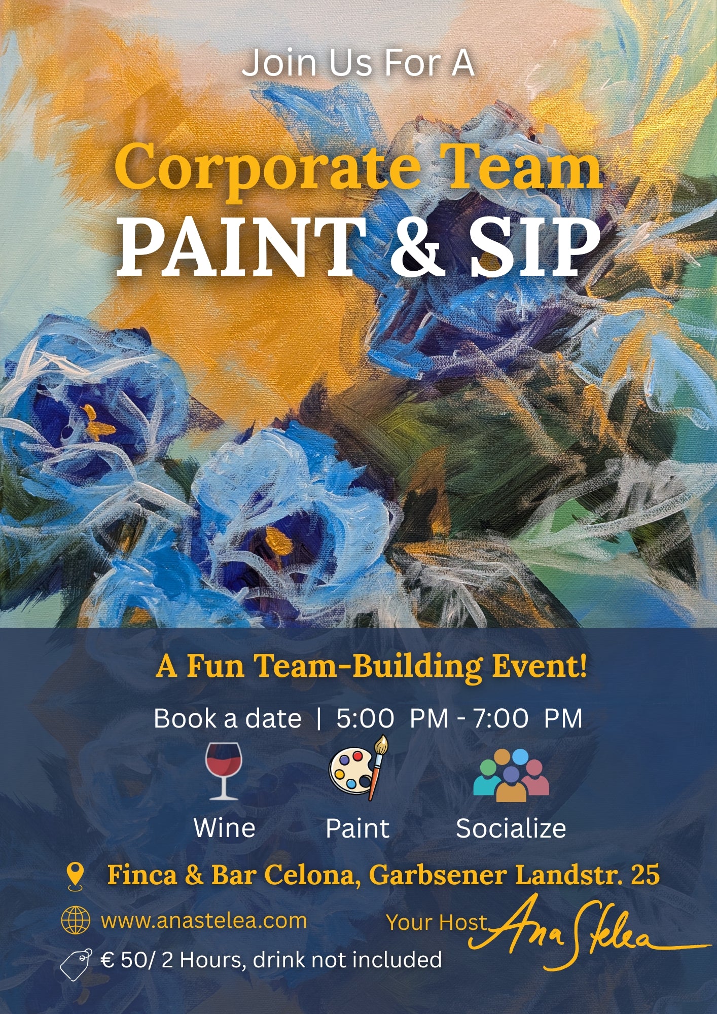 Join us for a Paint & Sip experience inspired by this expressive blue-and-gold floral composition. With guided instruction and a relaxed atmosphere, you’ll explore texture, movement, and bold color—while enjoying your favorite beverage. Perfect for beginners and seasoned creatives alike.