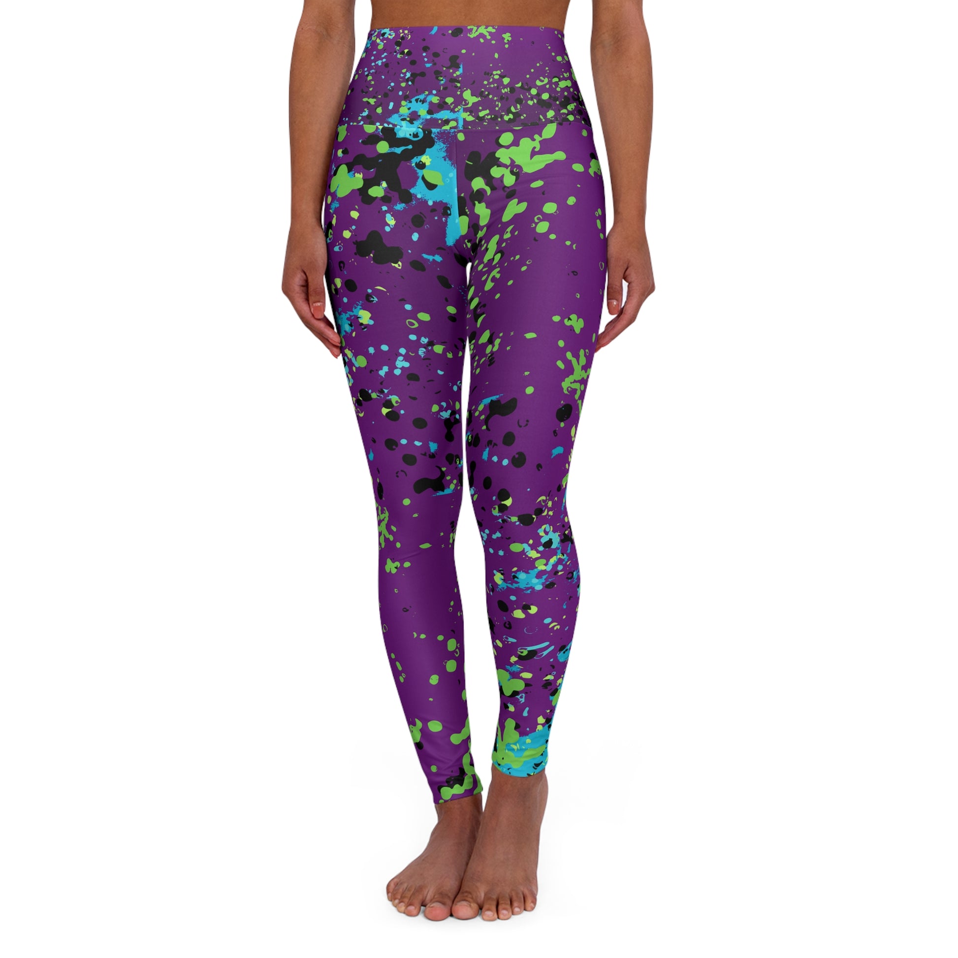 These vibrant all-over print yoga pants bring movement and color to your practice. The stretch-forward fabric moves with you — bending, reaching, and flowing without resistance — while the vivid splatter pattern blends purple, teal, and neon accents for an energetic, artful look. Lightweight enough for long sessions and layered days, they sit smoothly along the hips and hold shape through dynamic sequences. Wear them for slow mornings on the mat, sweaty vinyasa, or when you want a burst of color in your everyday routine. The result is confidence in motion and a bold expression that feels like you stepped into your own personal gallery.